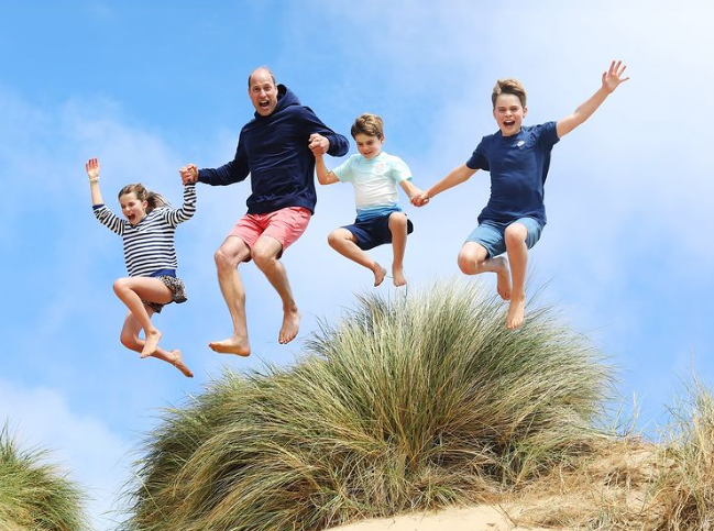 웨일스 왕자의 생일인 6월 21일에 공개된 또 다른 해변 사진에서 샬럿 공주, 윌리엄 왕자, 루이스 왕자, 조지 왕자가 손을 잡고 뛰어오르는 모습이 담겨 있습니다 .