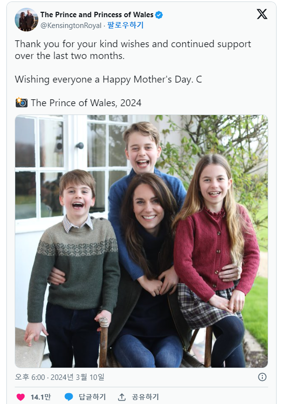 5월에 기념되는 미국의 어머니날과 달리 영국의 어머니날은 사순절 넷째 일요일인 2024년 3월 10일이다. 이처럼 웨일즈 공주 캐서린은 자신과 함께 찍은 사진을 공개했다. 케이트 미들턴이 계속해서 대중의 눈에 띄지 않은 후 명절을 기념하기 위해 세 명의 자녀가 왕실 팬들 사이에 우려를 불러일으켰고, 일부는 결과적으로 케이트 미들턴에 대해 걱정하기 시작할 때라고 느끼기까지 했습니다. 공주는 지난 1월 복부 수술을 계획했고 부활절이 지나야 직무에 복귀할 것으로 예상됐다.